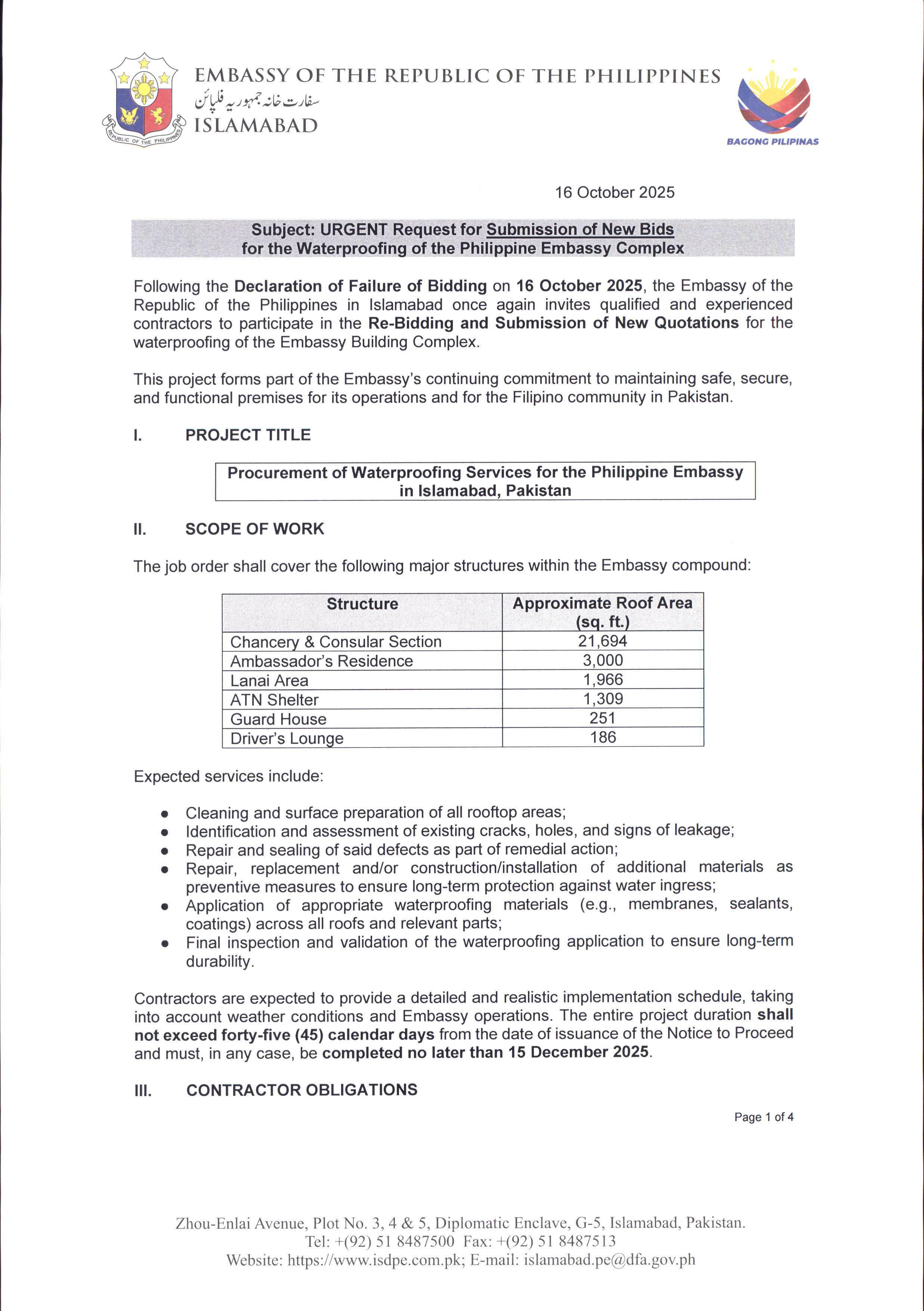 Invitation to Bid dated 16 OCTOBER 25 URGENT REQUEST FOR SUBMISSION OF NEW BIDS FOR THE WATERPROOFING OF THE PHILIPPINE EMBASSY COMPLEX |