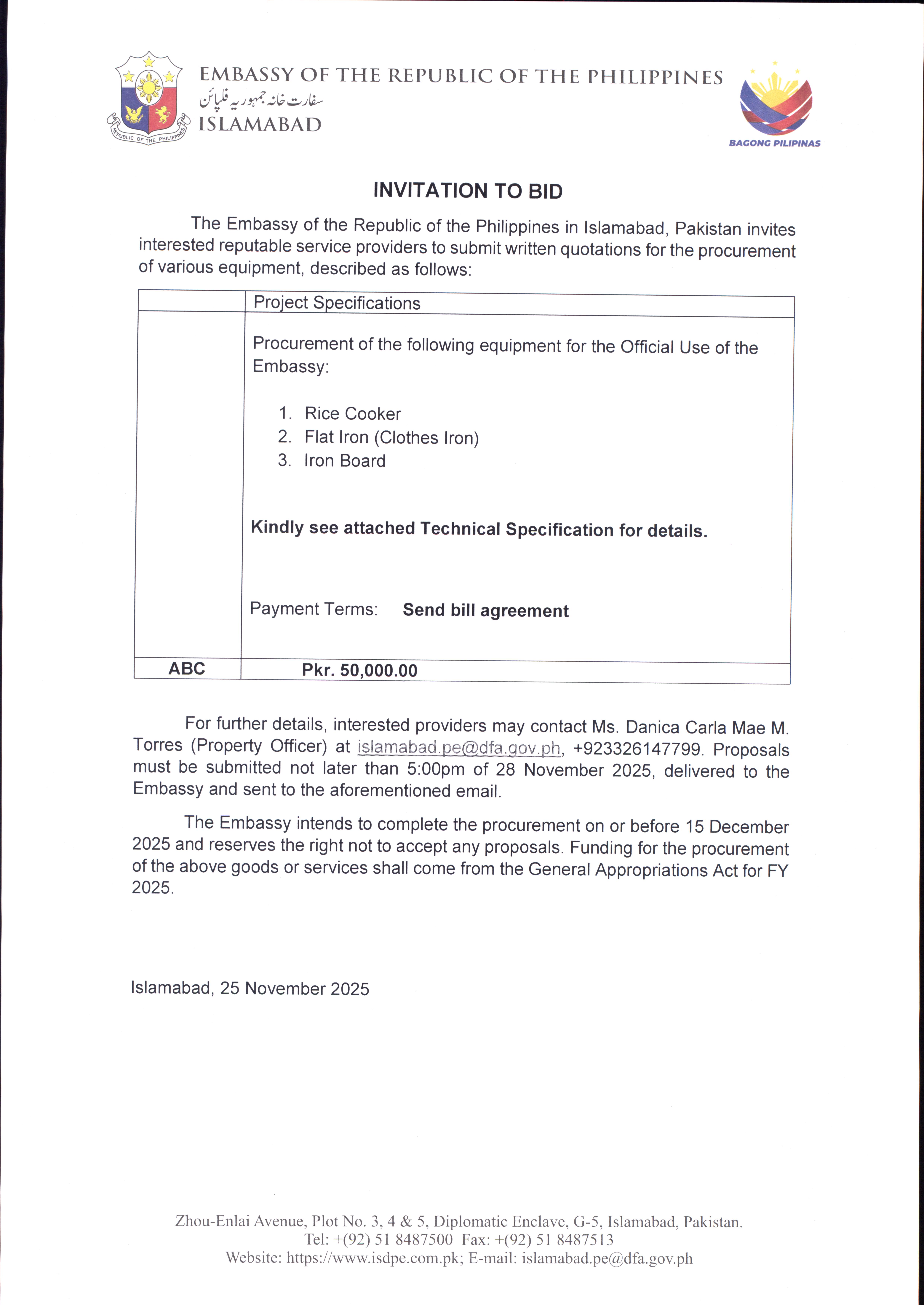 | PROCUREMENT PROJECT TITLE | INVITATION TO BID AND REQUEST FOR SUBMISSION OF TECHNICAL AND FINANCIAL QUOTATIONS FOR THE PROCUREMENT OF HEATING, VENTILATION AND AIR CONDITIONING (HVAC) UNITS FOR THE PHILIPPINE EMBASSY COMPLEX IN ISLAMABAD, PAKISTAN | ||||||